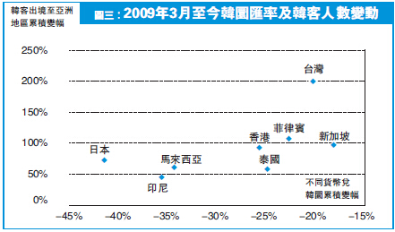 除了日圓,筆者亦十分好奇近年亞洲貨幣中最強勢的韓圜,韓客選擇旅遊地區會否跟匯價強弱扯上關系呢?舉例來說,日圓兌港元的貶值幅度比韓圜大,港人理應取日棄韓,因赴日的消費成本相對較低。但圖三見到,2009年3月(韓圜兌美元見底日)至今日圓、印尼盾及馬幣兌韓圜的貶幅最大,而韓客到這三個地方的旅客人數縱有升幅,卻明顯不及台灣及新加坡等兌韓圜貶值幅度相對較小的地方。故此,結論與圖二相同:匯價強弱與旅客到訪興趣沒有太大關連。