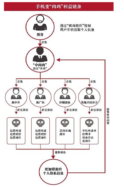 上述人士表示,這些所謂的“抓雞教程”的市場需求非常廣大,抓“肉雞”出售或轉讓,盜“肉雞”的信息資料等轉手出售,控制“肉雞”點擊廣告、網站、下載App,甚至偷拍“肉雞”主人的隱私照片來實施巨額敲詐。