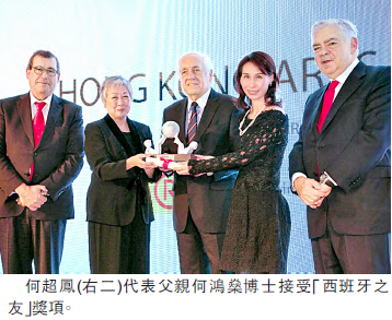 【香港商報網訊】何鴻榮博士聯同香港藝術節獲頒發「西班牙之友」獎項,以表揚他們對推廣西班牙文化的貢獻,為香港呈獻多個西班牙重要的文化節目。頒獎典禮於2015年12月3日假朗廷酒店舉行,由何鴻榮女兒何超鳳代表接受獎項,當晚亦欣逢香港西班牙商會25周年晚宴,西班牙國家品牌政府高級事務專員Carlos Espinosa de los Monteros先生出席主禮。