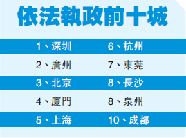 【香港商報網訊】中國政法大學法治政府研究院昨日發布《中國法治政府評估報告2015》。報告結果顯示,在100個被評估城市中,深圳、廣州和北京分別列在前三位。有62個城市得分在600分以上,38個城市得分在及格線以下。也就是說,中國仍然有超過三分之一的被評估城市的法治水平處於不及格狀態。這也說明,地方層面的法治政府建設雖然有提升,但部分地方法治政府建設的整體水平仍然不高。