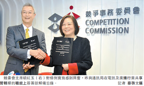 隨著《條例》全面實施,為協調競委會與通訊事務管理局在電訊及廣播行業共享管轄權的職能,雙方昨日簽署諒解備忘錄,承諾在執行職能時,確保《條例》中條文的詮釋及應用一致,并會快速有效地處理相關事件。對於共享管轄範圍內的事宜,規管廣播業及電訊業的通訊局將擔當主導機關的角色。競委會亦推出全新網站,為商界、中小企及消費者提供互動平臺,公眾可利用網站進行查詢、投訴、查找各類申請及程序的詳情。競委會歡迎市民或業界具名、匿名或找中介人如律師,在網上填表格、電郵或親身到競委會進行舉報。