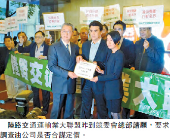 由24個運輸業團體組成的「陸路交通運輸業大聯盟」,昨早就到競委會投訴本港5間油公司涉嫌合謀定價,違反競爭守則,要求競委會進行調查。大聯盟發言人蔣志偉表示,分析了過去5年香港5間油公司扣除入油折扣后的車用燃油零售價格和調整價格的行為模式,發現存在高度的一致性,有涉嫌合謀定價違反競爭守則的可能。他說,國際油價持續下跌,已由最高價120美元下跌至36美元,但本港油價依然高企,柴油亦只由12.8元下跌至10.3元,司機須承受高成本壓力,收入被蠶食,對運輸業影響極大。