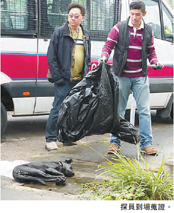 昨晨近8時,一名村民發現其中2隻狗竟突然死亡,四下尋找,只找到一隻狗無恙,而另一隻則不知所終。警員到場調查,發現一隻掛有頸圈的黑色唐狗,倒斃在水蕉新村路行人路上,身體僵硬,全身濕透;另一隻狗的尸體,則在附近一個貨倉內發現。