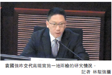 立法會鐵路事宜小組委員會昨早就高鐵事宜舉行特別會議,律政司司長袁國強、運輸及房屋局局長張炳良等出席。袁國強先表明:「工程費用超支與『一地兩檢』是兩個性質完全不同的問題。工程費用超支是工程管理的問題;『一地兩檢』是高鐵通車后的運作模式的問題。」他說兩者不應掛鉤,否則會產生混淆,無助解決問題。