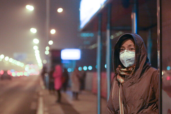2015年12月9日,北京。國貿附近的一處公交車等候區,戴口罩的市民。當日,霾橙色預警和空氣重污染紅色預警中,京城仍處于霧霾的圍困當中,能見度較低。 澎湃新聞記者權義圖