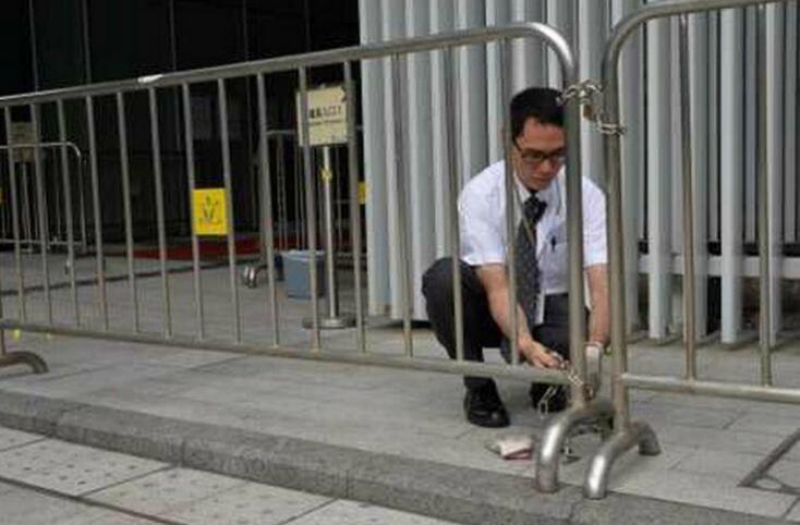 今早在立法会大楼外,多个出入口都摆放了铁马,而举行集会的示威区,主要的出入口亦继续架设一排及腰的防护栏,并已用铁链及胶索带固定。