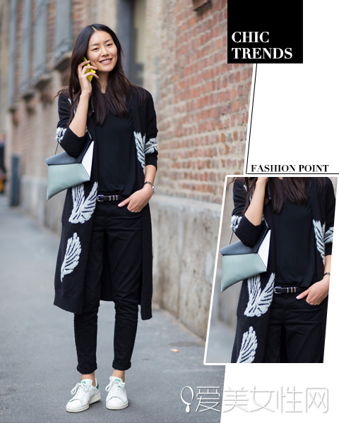 LOOK:翅膀图案黑色长款毛衣外套+黑色紧身裤+白球鞋+几何拼接链条包