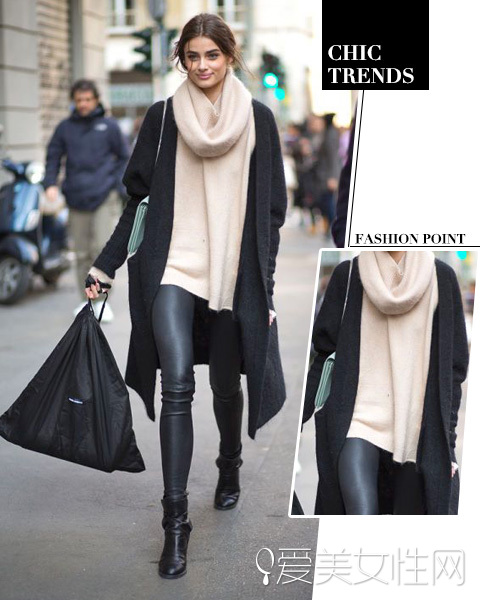 LOOK:米色高领针织衫+黑色长款毛衣外套+黑色紧身皮裤+短靴