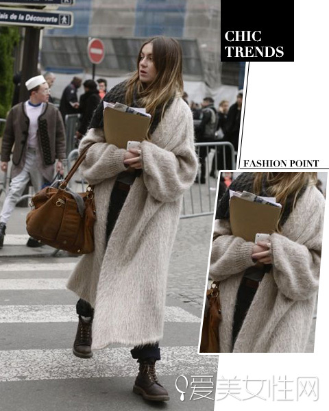学习超模刘雯表姐的街拍look吧,对于大长腿星人来说长款毛衣外套绝对是提升气场必备啊,全身黑色搭,简单的图案和拼接包包凸显造型感。