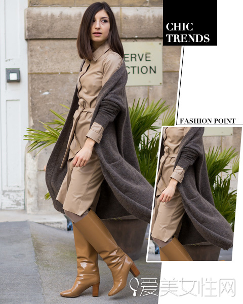 LOOK:卡其色腰带衬衫裙+漆皮长筒靴+灰色毛衣外套