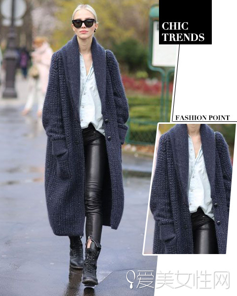 衬衫混搭皮裤超级帅气,一件大大的oversized毛衣外套增添了慵懒时髦的感觉,走起来就觉得hold住全场!