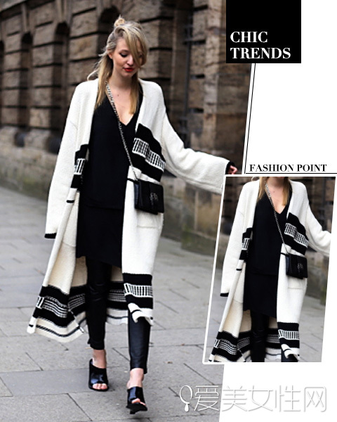 LOOK:黑白图案长款毛衣外套+黑色连衣裙+紧身皮裤+鱼嘴凉拖+链条包