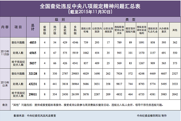 梳理2015年9至11月的数据,记者发现:11月与9月、10月相比,查处问题数分别增加38.5%、26.9%,处理人数分别增加41.3%、31.5%,给予党纪政纪处分人数分别增加46.3%、44.9%。这说明,一方面,全国各级纪检监察机关铁面纠“四风”始终力度不减、驰而不息;另一方面,“四风”病原体尚存,必须强化执纪力度,形成持续震慑,坚决防止“四风”反弹。