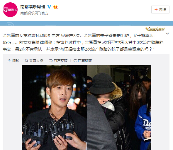 据报道,金贤重前女友称曾怀孕5次,男方:只流产3次。金贤重的亲子鉴定据出炉,父子概率达99%,前女友崔某律师称:在审判过程中,金贤重在5次怀孕中承认其中3次流产堕胎的事实,另2次不肯承认,并表示“有证据指出那2次流产堕胎的孩子都是金贤重的吗?”
