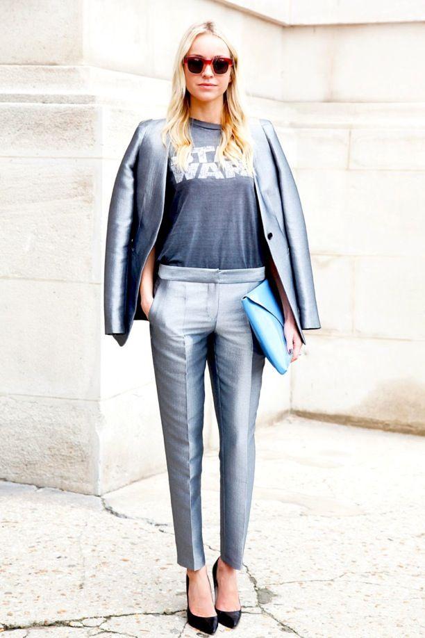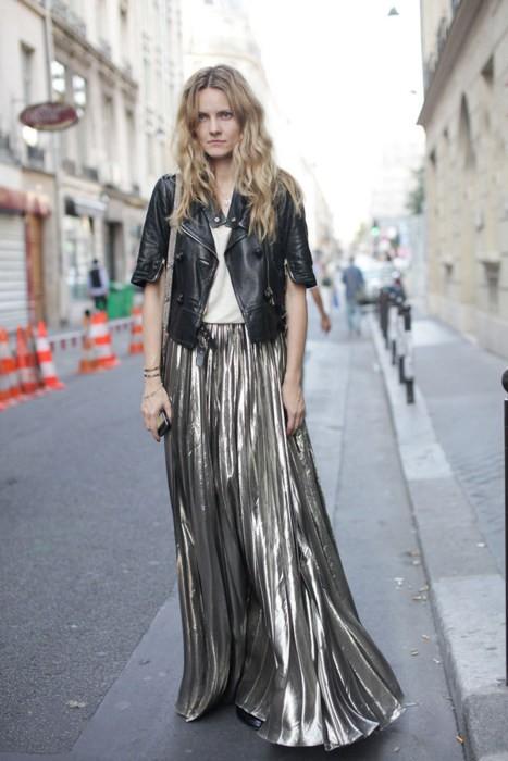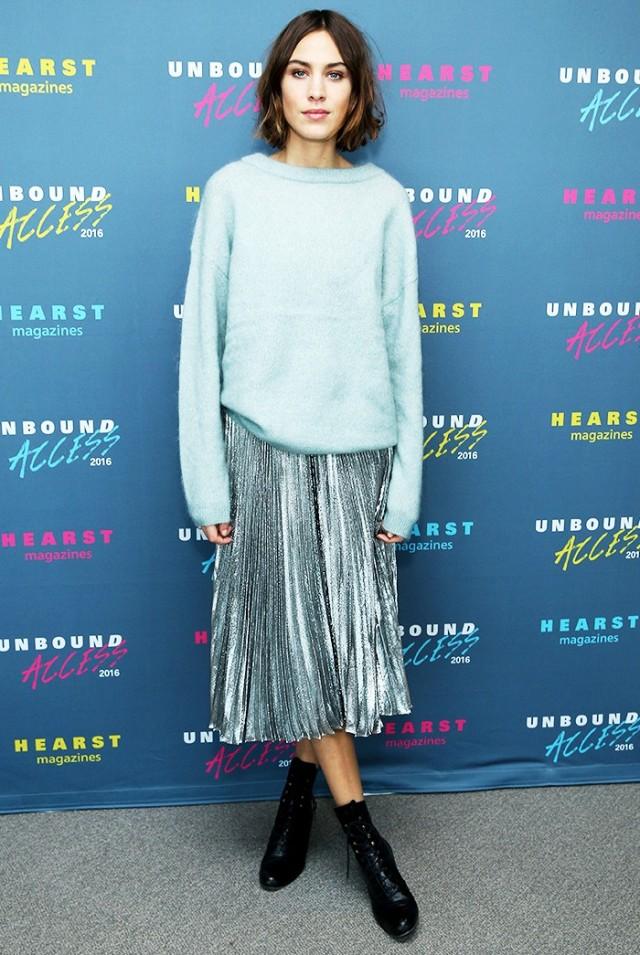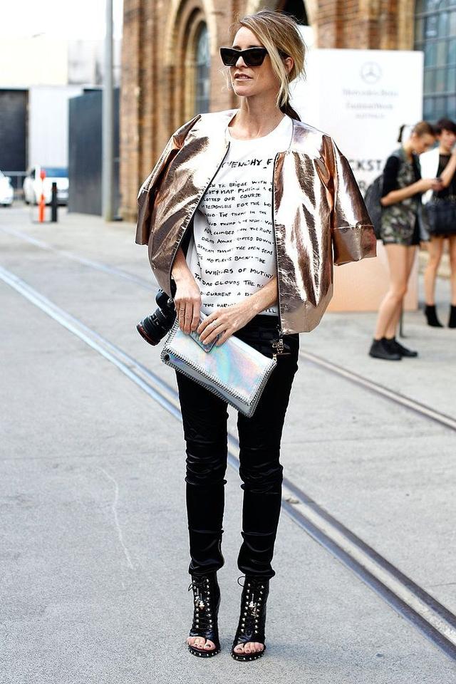 在时装周秀场上,像星星点缀的杜嘉班纳连衣裙、Moschino家的马术装、Stella McCartney的金缕衣、CK的简约连衣裙等等,这些都用金属感面料设计而成。他们既适合高端场合,休闲别致的外观也适合平时穿搭。 今天就来一起看看这些金属感的面料都怎么搭配吧,我相信你的衣橱也一定有一件这样的单品了吧? 【今日穿搭】 金属感面料百褶裙+兔毛毛衣 时髦的金属感面料不仅仅被应用在鞋子包包上,稍加留意你就能发现,现在就连卫衣、裙子也运用起未来感面料啦! 中英混血IT Girl艾丽珊·钟的搭配总是自然又时尚,想想我们也有的百褶裙、我们也有的兔毛毛衣,这样的搭配,仅仅换上一个金属感半裙就能增添许多时髦度了,Ps.还记得今年的年度色彩之一吗?静谧蓝。就是钟小姐毛衣的颜色,一身搭配如此多的时尚点,看似平常的搭配却时髦的不要不要的。 【搭配Tips】 Tips1:香槟金+彩虹色 24K纯金色已经过时啦。嫌金色太土?香槟金就是个不错的替补选择。香槟金时髦又不至于亮瞎眼,优雅之余时髦度UP~钟小姐搭配她的香槟金裙,是配了一件彩虹色紧身毛衣,太抢眼。。 Tips2:黑金+灰色 铅笔裙能给女人增添多少气质已经说过很多次啦(今天穿什么:优雅季你需要一款铅笔裙),不总是说女生“主要看气质么”,铅笔裙就是提升气质不二之选了,但是如果你选择了金属感十足的黑金色,可以像钟小姐这样搭配灰色毛衣哦,唯一美中不足的是,绞花上衣太复杂,裙装也是竖条纹太繁密,其中一个单品简约些会更好哦。 Tips3:金色+黑色 黑金黑金,如果你真的不知道金色该跟什么服装搭配的好的话,那就选择黑色吧,至少不会出错的搭配,当然这款金色的小短搭,也是精致又可爱。感觉就算是一颗沙子,也是镀了金的沙子,走到哪里都发亮。 Never Do1:金属感长外套要慎穿。这个外套说实话金属感太强,又没有什么设计感,像披了一块收集太阳能取暖的展布。