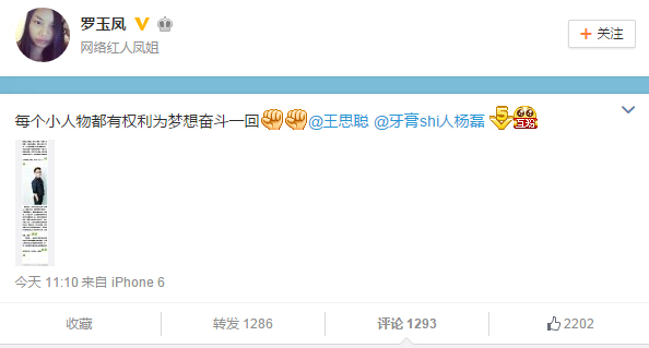 凤姐微博原文:“就是这么残酷,我追逐梦想,只身来到美国,实际上则是为了生存。人们总是看到人红后闪耀的光环,却往往忽略了孤独奔跑时脚丫子底下火辣辣的疼痛。而对于王思聪这样含着金钥匙出生的人,他的梦想似乎更能称之为梦想,事业、生活、女人……我的知己,身为90后的企业家牙膏诗人杨磊说过,想要梦想不被泯灭,不管朝哪努力,都要执着和坚定,肯吃苦,少关注光环,让追逐梦想的你们和我们含金量更高一些。我和他有相似的经历,都很小就从家乡走出来了,他16岁进入社会,从社会底层穿过弱肉强食的丛林,顽强生长,终小有成就,还因其巨大影响力登上了纽约时代大屏,令我钦佩、崇拜!我发现,一块资质上等的宝石如果没有后天的神奇雕琢也难以耀世,不要让梦想仅仅成为你睡前的安眠剂。”