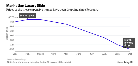 新浪美股訊 北京時間25日彭博報道,曼哈頓豪宅市場正在失去吸引力。據StreetEasy衡量20%頂級住宅市場轉售價格的指數,曼哈頓最貴住宅的售價中值10月份降至359萬美元,同比下降2.2%。自2月份升抵紀錄高位、中值達到372萬美元之后,豪宅價格就逐月下滑。