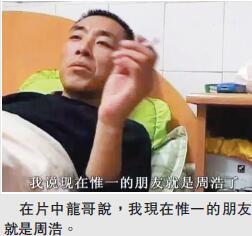 「他現在仍在雲南服刑,他在監獄里面也沒人去支持他,我還會給他寄一些錢。就我跟他的關系,他出監獄以后肯定第一個會來找我。」對於跟龍哥的關系,周浩說「沒法定義,說不清楚,理不明白」,「雖然他認為這麼多年的朋友就是我,但我未必認為我們之間是朋友,就是一種關系,別去定義它也別去描述它」,「他大概還有五六年出來,我們兩個關系仍會繼續。」