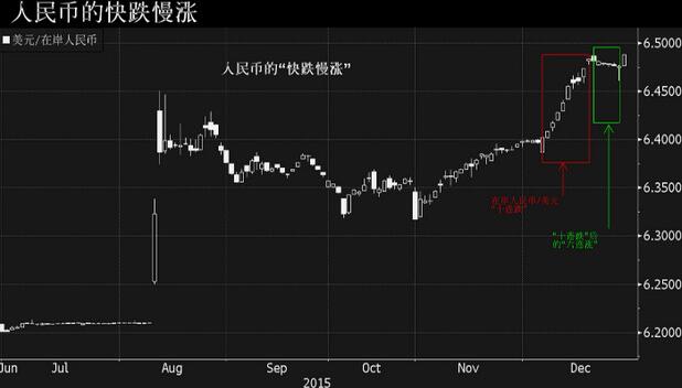 彭博数据显示,从12月4日开始,在岸人民币兑美元经历了“十连跌”,跌幅累计超过1000个基点,从美元6.38一路走弱至6.48。在此后的六个交易日中,人民币又实现“六连涨”,但涨幅却只有74点,或0.12%。