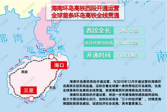 据了解,海南环岛高铁西段12月30日开通运营,与2010年12月开通运营的海南环岛高铁东段实现连通。这标志着全球第一条热带地区环岛高铁,也是全球首条环岛高铁全线贯通,旅客乘高铁环游海南岛成为现实。