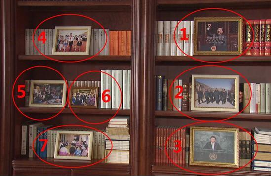 “政事儿”注意到,习近平办公室内部有些细微的变化,与发表2015年新年贺词时相比,其身后的书架上多了七张今年的新照片。