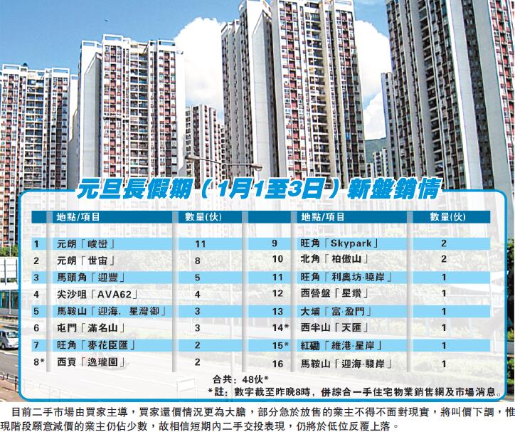 綜合一手住宅物業銷售網及市場消息,過去三日元旦長假期,市場共僅錄約48宗一手買賣成交,其中豪宅市場最為矚目,市傳恒地西半山「天匯」日前再沽出一伙位於42樓A單位,成交價約2.165億元,以單位實用面積3060平方尺計算,尺價高達約7.08萬元;另一邊廂,信置(083)西貢「逸瓏園」及長實(1113)紅磡「維港·星岸」,亦分別沽出兩伙及一伙。