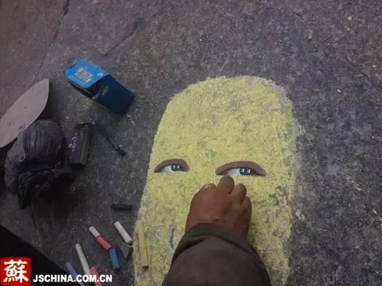 但一画完,他就会用随身携带的瓶装水把画冲洗干净,然后才离去。