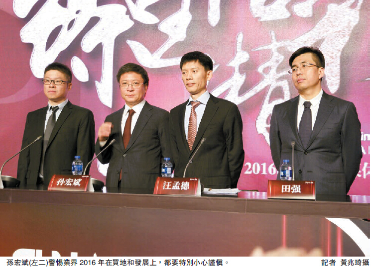 內地經濟下行仍未見底,房地產企業面對很大挑戰,孫宏斌警剔業界2016年在買地和發展上,都要特別小心謹慎。他說:「經濟下行壓力挺大的,中國的經濟,我覺得離觸底還有一段的距離,我其實挺不樂觀,我一直比較悲觀,包括行業很悲觀,中國經濟壓力這麼大,行業能特別好?我覺得這也不太現實。」