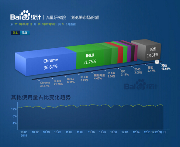 為什么IE8一枝獨秀?兩個原因:第一,這是最后一款支持Windows XP的版本的IE,也就是說,Windows XP用戶可以升級到的最高版本就是IE8;第二,360安全瀏覽器使用的IE8內核,因為種種原因,百度統計將其市場份額歸入IE8內。
