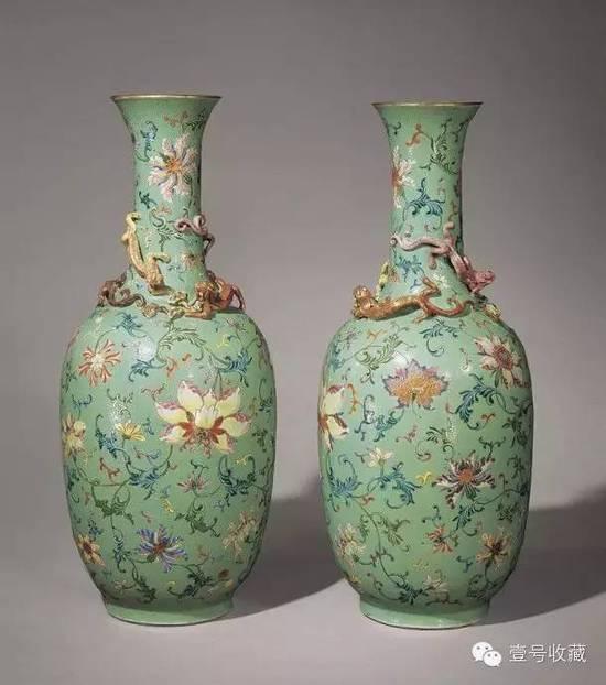 松绿地轧道锦纹粉彩缠枝花卉纹贴螭龙瓶 清乾隆