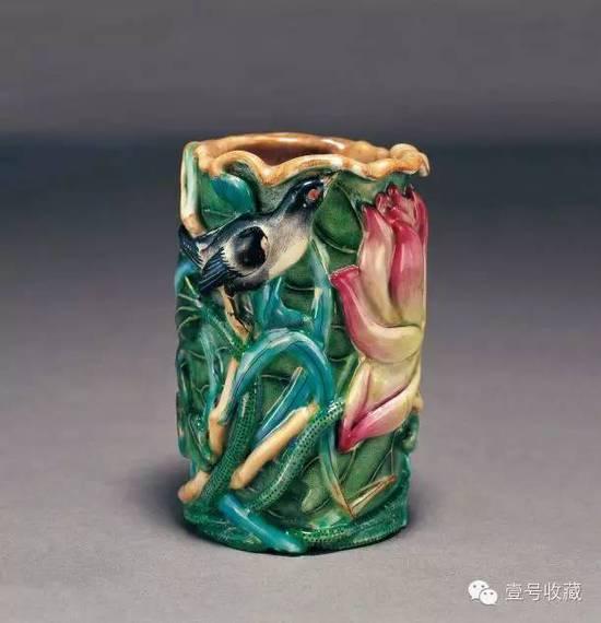 粉彩雕莲花花鸟笔筒 清 道光