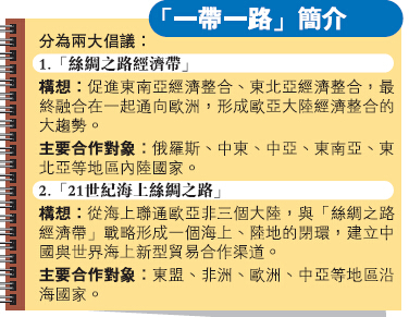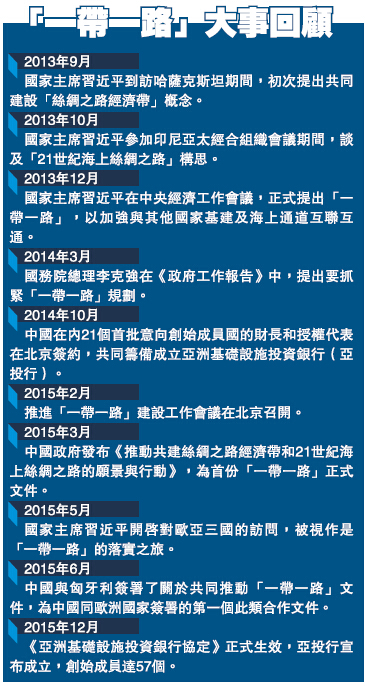 去年3月的兩會答記者問中,中國外交部長王毅提出的2015年中國外交的「一個重點、兩條主線」,其中「一個重點」就是全面推進「一帶一路」。中方會秉持共商、共建、共用原則,堅持平等協商,尊重各國的自主選擇,注重照顧各方舒適度,注重保持透明和開放,注重與各國的發展戰略相互對接,注重與現有的地區合作機制相輔相成。