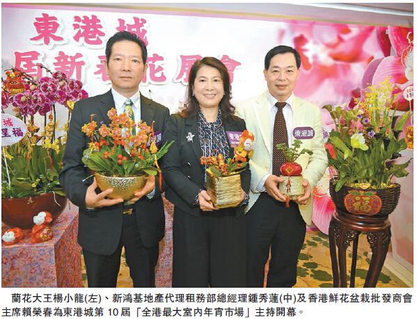 新鴻基地產將軍澳旗艦商場東港城將於本月23日至2月7日,連續第10年舉辦全港最大的室內年宵市場,在過去9年已累積近500萬入場人次,總營業額達4000萬元,吸引來自各區的市民前來選購年花。今年亦推出多項優惠給市民,包括花價將抗通脹,連續第6年維持不變,10年前的震撼價1元發售限量100株開運蘭花,先到先得,額滿即止。