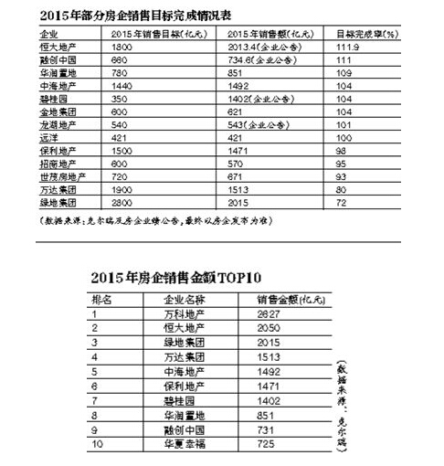 在上述多家企業超額達標的同時,也有一些房企沒有完成全年目標。根據克爾瑞數據,保利地產2015年銷售1471億元,與其1500億元的年度目標相比,僅實現98%;而萬達和綠地的年度銷售分別為1513億元、2015億元,達標率分別為80%和72%。
