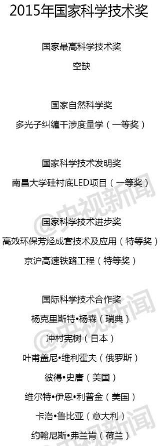 2015国家科学技术奖获奖名单