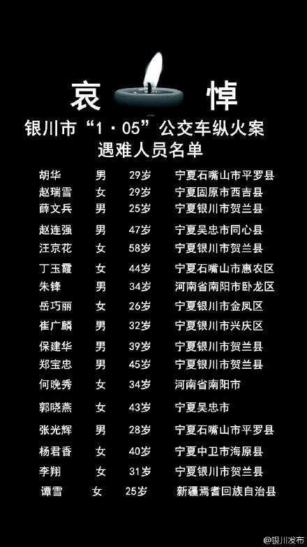 1月5日7時許,銀川市公交公司301路由賀蘭縣天駿花園開往銀川火車站的公交車,行駛到109國道賀蘭縣金盛國際家居廣場門口時,突然發生火災。經核實,目前事故已造成17人遇難,另有33人受傷。犯罪嫌疑人馬永平已于5日16時30分許被警方抓獲。
