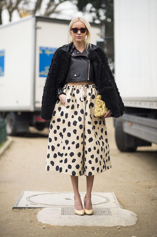 A字裙最具有淑女风了,好像和酷酷的皮夹克格格不入,但是两件单品的碰撞,效果还是不错的。