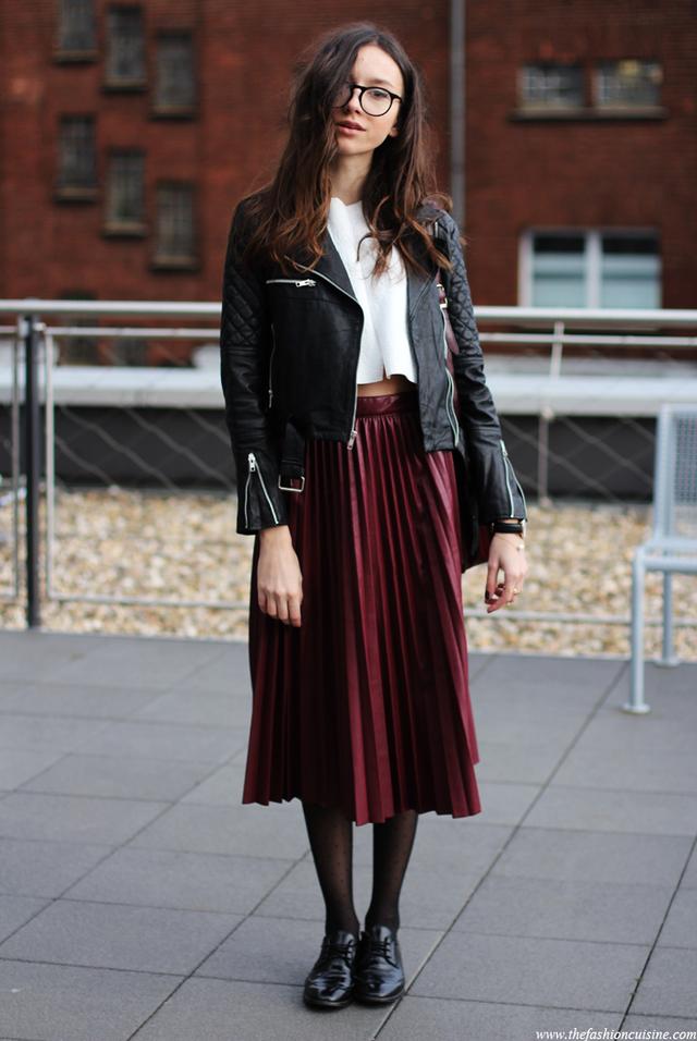 谁说皮夹克穿不出来小清新的感觉呢?搭配上姨妈红色的百褶裙,皮夹克也照样能穿出小清新风。你说看脸?也对。。