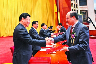 1月8日,2015年度國家科學技術獎勵大會在北京人民大會堂隆重舉行。習近平等黨和國家領導人向獲獎代表頒獎。 新華社記者饒愛民攝