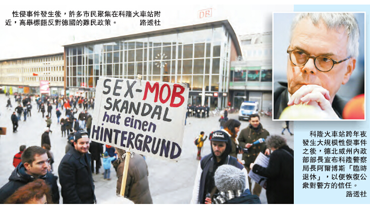 【香港商報网綜合報道】科隆火車站跨年夜發生大規模性侵事件後,由於當地警方被指辦事不力,德國北威州內政部部長當地時間8日宣布,科隆警察局長阿爾博斯要「臨時退休」,以便恢復公眾對警方的信任。警方並已在31名疑犯中,認定18人的身份為難民。分析稱,案件與難民問題交織使事態呈複雜化趨勢。而德國一些政客和媒體呼籲,不要隨便將性侵案與難民聯繫起來,以防極右翼勢力藉機宣傳排外思想。