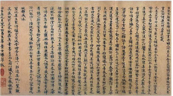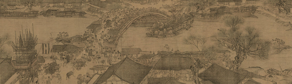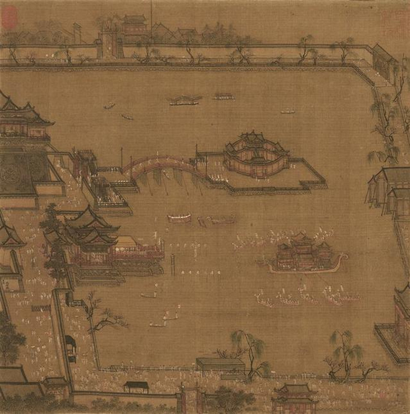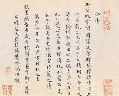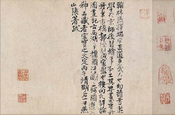 《金明池争标图》 张择端(署名) 现藏于天津博物馆 出生于琅琊东武的张择端,在游学京师后开始学习绘画。开始以画界画为主,尤其擅长于舟车房屋,田园市井。“界画”,是中国画早期的重要绘画形式之一,在隋朝达到鼎盛,界画即是拿界尺创作,多以古代城市建筑景观为主。随着文人画的出现,界画逐渐被嫌为“匠气”而没落。而后张择端成功加入由赵佶发扬光大的画院,成为了一个翰林。然而以画风俗画擅长的他,在当时是注定要郁郁不得志的,很简单,上(赵佶)有所好,富贵典雅的宣和体才是主流。与同时代的《千里江山图》相比,张择端跟《清明上河图》并没有引起多大反响。作为一副献给皇帝的画,哪怕这是副极力讴歌时局安稳,天下太平的作品,徽宗也并没有多重视这幅画,盖了标志性的双龙小印,以瘦金体题写了画名《清明上河图》后,便赐给了当时的显族向氏向宗回家,并被记录在其私人收藏《向氏评论图画记》。 然而徽宗不知道的是,他将画中的繁华汴京赏赐给大臣后,现实的汴京也即将离他而去。 赵佶双龙印章(《清明上河图》版已佚) 只会画花鸟鱼虫的皇帝,是守不住江山的。靖康年到了,金兵南下,北宋灭亡,皇帝都“北狩”了,遑论一幅画,随着金兵贵族的大肆掠夺,《清明上河图》流落到了金国的民间。直到靖康年的60年后,金朝汉族布衣张着为《清明上河图》提下了第二个记录,一人得道,张着的朋友,同为宋朝遗民的张公药、郦权、王磵、张世积也相继作了诗题。 不知汉人张着在金朝生活的如何,看到画中已被金人夷为焦土的繁荣都城,怕是一定会很怀念暖风熏人的汴京和故国。然而他却以另一种方式与《清明上河图》永载青史,他的这一题跋是学界认为本画作者为张择端的最重要依据。如无此题,此画现在怕是佚名。 “翰林张择端,字正道,东武人也。幼读书,游学于京师,后习绘事。本工其界画,尤嗜于舟车、市桥郭径,别成家数也。按《向氏评论图画记》云:“《西湖争标图》、《清明上河图》选入神品。”藏者宜宝之。大定丙午清明后一日,燕山张着跋。”张着题清明上河图 张著题清明上河图 十九年后,张着因诗名当上了金朝一名小官。而第二任收藏《清明上河图》的向氏家族,则在靖康后的抗金战争中,“阖门皆遇害,唯一子鸿六岁得存”(宋史)。 ‘画桥虹卧浚仪渠,两岸风烟天下无。满眼而今皆瓦砾,人犹时复得玑珠。繁华梦断两桥空,唯有悠悠汴水东。谁识当年图画日,万家帘幕翠烟中。张世积题清明上河图 张着之后,蒙古铁骑南下,灭了金,灭了宋,屠了城。而《清明上河图》也被到处搜刮财宝的元朝统治者收入皇宫。此时历经战乱流转《上河图》已近百岁,破损污浊可想而知,既然进了宫便需要重新装裱。然而这一副讴歌描写汉人北宋首都的作品,显然也难成元朝统治者心爱之物,此画随后便被装裱匠人以临摹本掉包,卖给了当时的“贵官某氏”。至此第一个有史可载的《清明上河图》临摹本出现。 “我元至正之辛卯,准寓蓟日久,稍访求古今名笔,以新耳目.会有以兹图见喻者,且云:'图初留秘府,后为官匠装池者,以似本易去,而售于贵官某氏,某后守真定,主藏者复私之,以鬻于武林陈某.....”杨准题《清明上河图》(节选) 而手握真迹的贵官某氏,也难称重视此画,在调入真定(今河北中部)为官后,被负责保管的手下监守自盗卖给了杭州人陈彦谦。怀璧其罪的陈彦谦生怕主人追究起来,又将此画转手卖给了杨准。知己难求,《清明上河图》亦如此,杨准倾尽家产买下了这幅画,并详详细细把张着之后这幅画的遭遇记录了下来,包括装裱师伪作赝品,偷出宫门,再偷出官员家门的过程,而这些题跋也因此成为学界研究清明上河图真伪、流转的无价之宝。 杨准题《清明上河图》 同年秋,杨准的朋友刘汉也在这幅画上题记,称此画为“稀世玩”,要杨氏子孙永世“珍袭”。这显然不可能,十几年后,清明上河图就又换了主人。而此时,元朝也快退出中国的历史舞台了。 到了大明朝,《清明上河图》先被首辅李贤收藏,历经李祁,吴宽,李东阳等人,漂泊流落在民间。后被严嵩、严世蕃以权势强行索去占有。作为明朝着名奸臣代表,严嵩在嘉靖41年被弹劾失势,斩首抄家,于是《清明上河图》再次进入皇宫,藏于明内府。 然而嘉靖作为一个破了不上朝记录的皇帝,一心修仙想来也不会对绘画感兴趣。到了万历年间,此画又流转到了权倾一时的秉笔太监冯保手中,这是个有文化有修养的太监,曾于御前待奉皇帝时见到此画,便认为这幅画是“比隋珠和璧还要珍贵的东西”。当时神宗皇帝朱翊钧年方16岁,尚未亲政,冯保大权在握,这也是他敢在内府藏的画中题跋的底气所在,并在题跋左下加盖《永享》印章,证明此时此画,已被其据为己有。 冯保题《清明上河图》 当然那有什么东西能永垂不朽,盖下“永享”印章并题字后四年,张居正去世,神宗逐渐手揽大权。作为张居正政治盟友,神宗显然不愿放过他,冯保失势,家产被抄,《清明上河图》则不见踪影,流落民间。 鹭津如寿题《清明上河图》 如寿是谁,今已不可考,这却是《清明上河图》的最后一首题诗。从冯保之后,一直到乾隆年间,这近百年的时间里,《清明上河图》的行踪成了一个谜,至今依旧了无头绪,直到陆费墀的出现。 陆费墀一定满腹委屈,作为“四库全书”的负责人之一,却被乾隆以一纸“舛谬丛生,应删不删,
