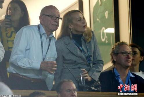 资料图:当地时间2015年10月31日,英国伦敦,传媒大亨鲁珀特·默多克和霍尔一起观看橄榄球世界杯决赛。