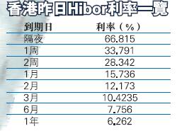 昨日,香港財資市場公會公布,人民幣香港銀行間同業隔夜利率(Hibor)升至驚人的66.815厘,創歷史新高。