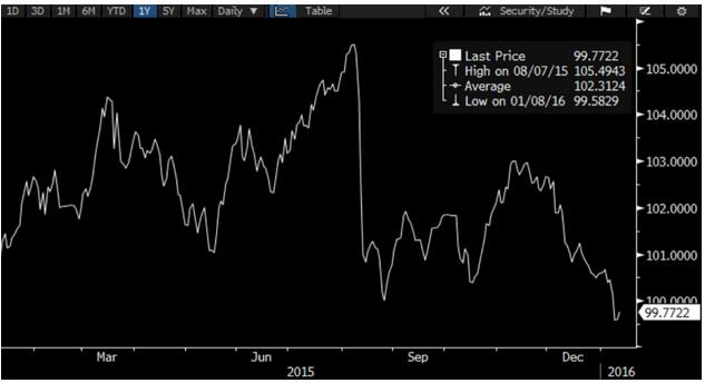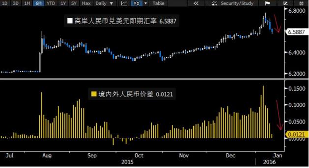 人民币的不断贬值也打击了投资者对人民币资产的兴趣,去年人民币离岸债券发行同比下跌38%。2015年在岸人民币兑美元全年贬值幅度达4.46%,而离岸人民币的贬值幅度更高达5.28%。2016年第一周,离岸人民币大幅贬值,较在岸市场一度贴水达到2000点的纪录水平。