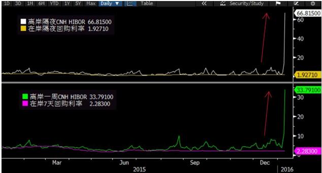 离岸人民币周一触及6.7078的日内低点后,24小时内强力拉升逾1000点,周二亚洲交易时段甚至一度较在岸人民币出现溢价,为去年10月份以来首见。周二香港人民币隔夜银行间拆借利率飙升至66.8%,达到有数据以来的纪录最高位,显示流动性已经极度紧张。自2013年6月推出以来,该市场的人民币银行同业隔夜拆息定价平均位于2.57%左右。