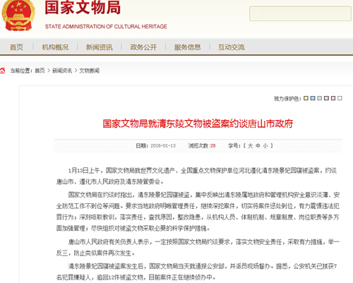 中新网1月13日电 据国家文物局网站消息,1月13日上午,国家文物局就世界文化遗产、全国重点文物保护单位河北遵化清东陵景妃园寝被盗案,约谈唐山市、遵化市人民政府及清东陵管委会。