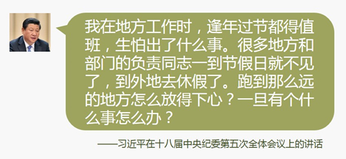 有的干部脫崗離崗了,不向組織匯報,借口說有些是私事,應該有“自由空間”。我在地方工作時,逢年過節都得值班,生怕出了什么事。很多地方和部門的負責同志一到節假日就不見了,到外地去休假了。跑到那么遠的地方怎么放得下心?一旦有個什么事怎么辦?