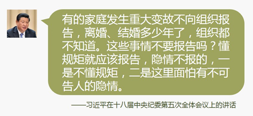 有些領導干部個人重大問題不報告。不是說非要家里出了命案才需要報告。有的同志有重病不報,對所有人都隱瞞了,最后病危了組織還不知道,場面上的工作都干不了了,但就是不說,最后命都給耽誤沒了。有的子女家屬長期在國外也不報告,在國外定居的按規定要報告,但他們也不是正式定居,就覺得可以不報告。有的家庭發生重大變故不向組織報告,離婚、結婚多少年了,組織都不知道。有的弄了很多證件,護照好幾本,還有假身份證。這些事情不要報告嗎?懂規矩就應該報告,隱情不報的,一是不懂規矩,二是這里面怕有不可告人的隱情。