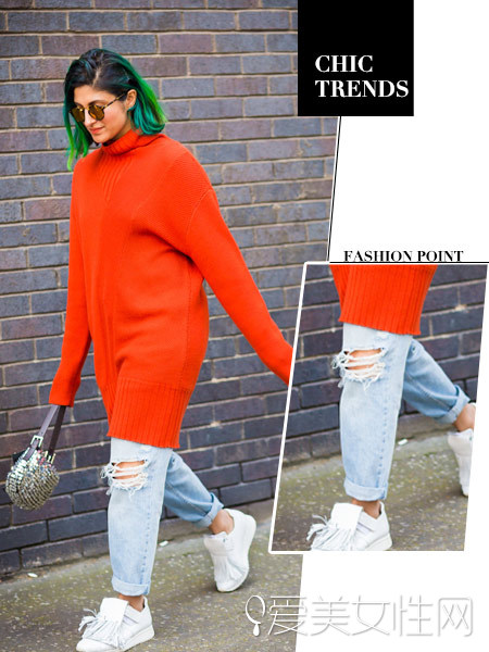 橙色的长款毛衣赚足了眼球,搭配破洞卷脚牛仔裤,潮流个性,白球鞋演绎街头风。