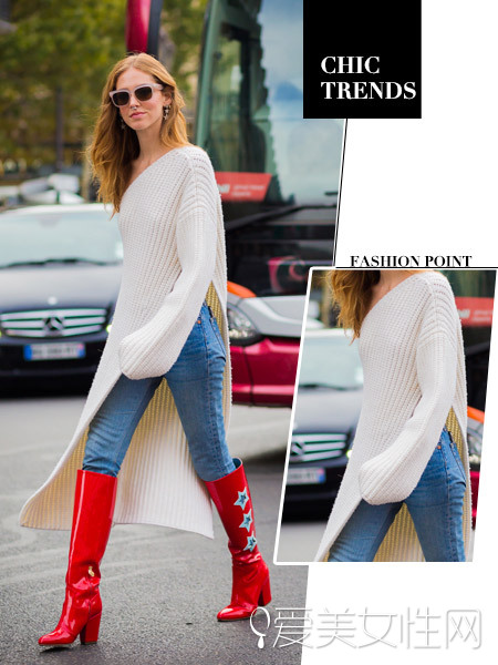米白色长款毛衣的大开钗非常引人注目,修身的窄脚牛仔裤摆脱臃肿,红色的长筒靴搭配相当大胆!